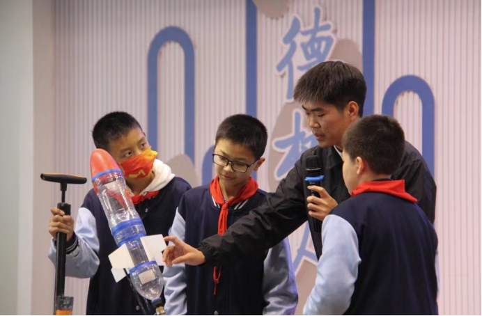 培训中,杨帆对水火箭的发射原理及发射所需化学药品进行详细介绍,并对相关化学方程式及物理公式进行了讲解说明,引发了同学们对科学知识探索的兴趣。互动交流环节中,浐灞第十学校的同学们围绕着水火箭的发射和内涵的物理化学原理进行了积极踊跃的提问。