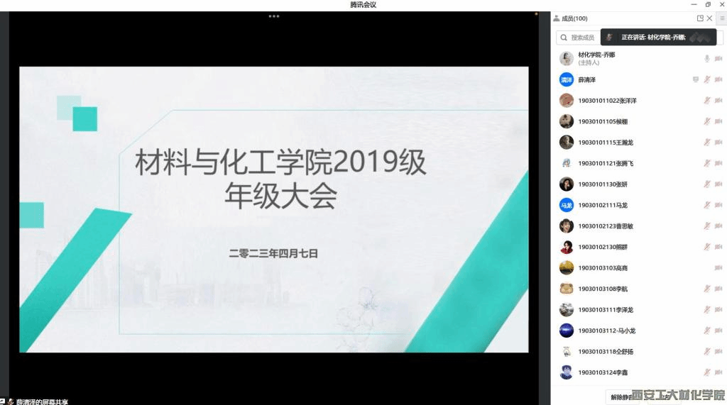 为进一步促进2023届毕业生就业工作,提高学生安全意识,材料与化工学院2019级于4月7日晚上7时召开线上年级大会,2019级辅导员乔娜主持会议,2019级学生参加会议。
