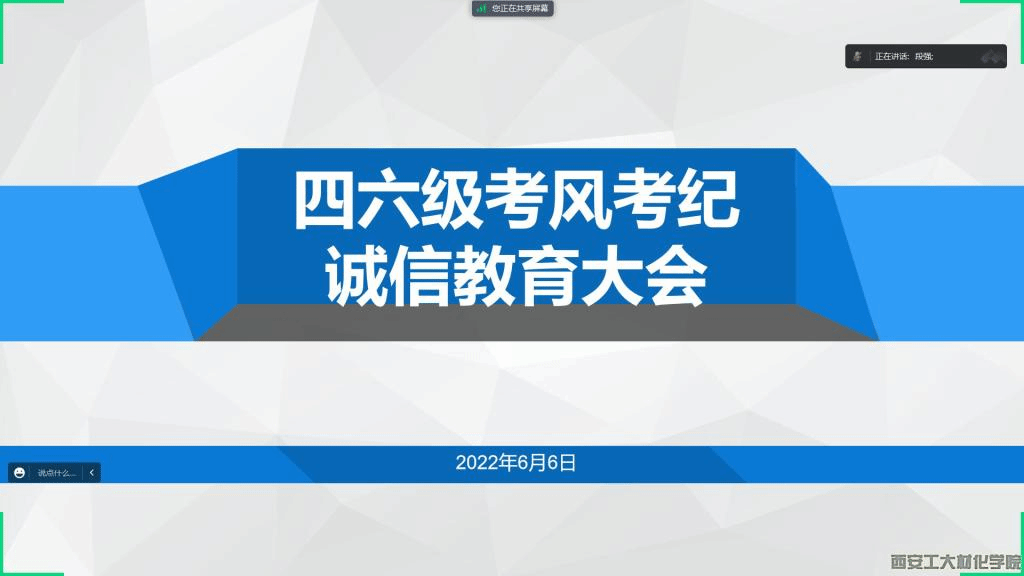 为树立学生诚信为本的道德观念,端正考风考纪,建设诚信校园,2022年6月6日,材料与化工学院2020级召开四六级考前诚信教育大会,2020级全体备考学生参加本次会议。会议由辅导员段强主持。