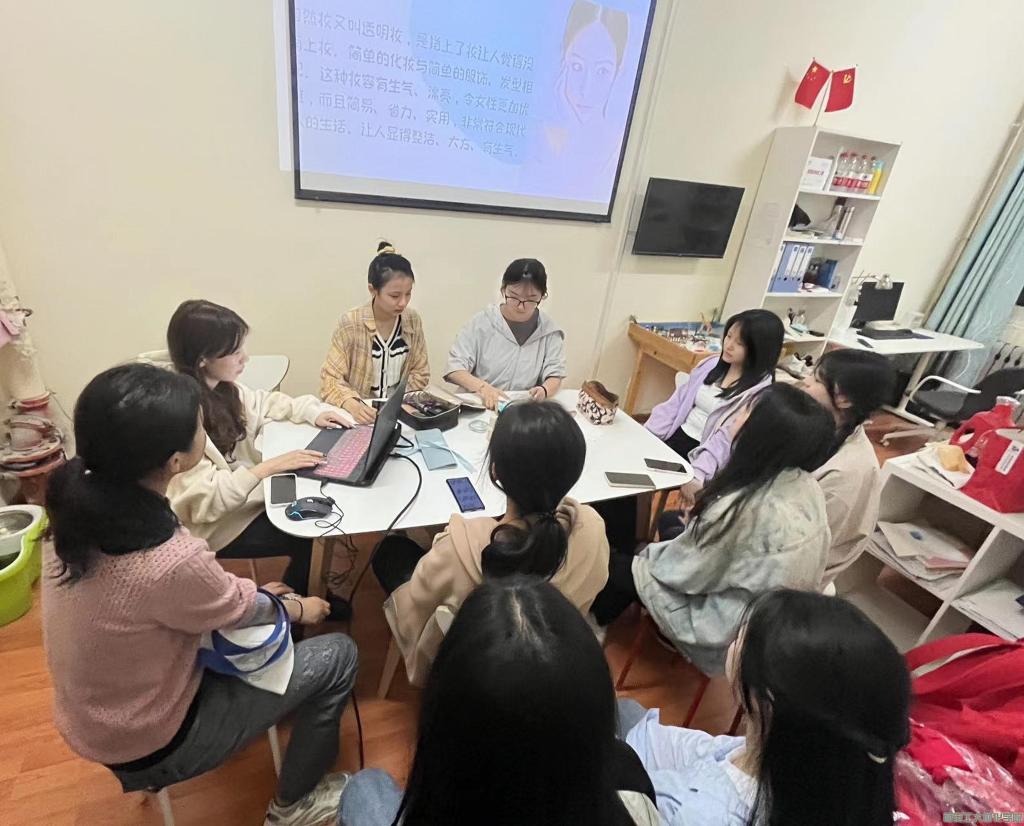 活动伊始,由学生干部任佳怡通过PPT讲解向大家普及了有关美妆工具的基础知识,以及简单向大家讲解了目前生活中常见妆容分类,以及不同妆容适配的不同场合。任佳怡同学讲述时生动大方,并联系实际生活,让同学们学会到更多有关彩妆的理论知识。随后由学生干部裴思文为一名同学现场示范化妆并进行更加细致的实践讲解,同学们也积极参与其中,积极提出自己日常生活中的化妆疑问,现场气氛活跃。活动最后,大家互相实践学习到的化妆技巧,并和其他同学共同解决化妆实践中存在的问题。活动实践阶段同学们取长补短,有效提高了自身的化妆技术。