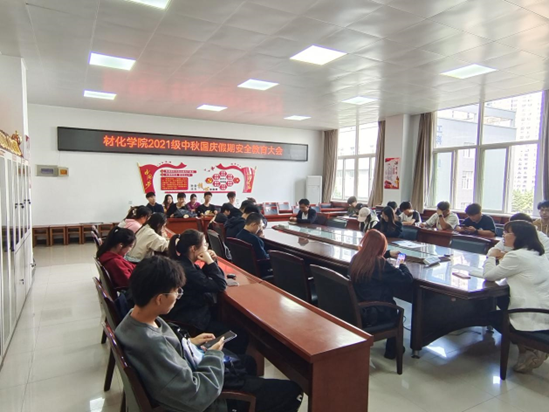 中秋、国庆长假来临之际,为进一步加强学生安全教育管理工作,增强同学们的安全防范意识,全面普及安全常识,让大家度过一个愉快且充实的假期,材料与化工学院于9月27日中午在工3-410召开中秋国庆假期安全教育大会,本次大会由2021级辅导员刘强珺主持,会议通过“线上腾讯会议+线下学生干部”召开,2021级全体同学参加本次大会。