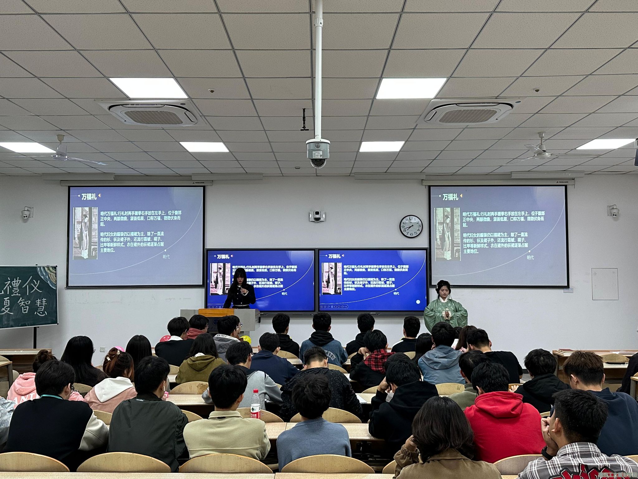 活动中,学生干部王国庆以汉服文化为切入点,结合图片以及视频的方式向大家介绍了汉服的历史及发展,并详细讲解了各朝代汉服的特点,展示汉服的古典美韵,了解汉服蕴含的道德内涵,同学们从讲解中进一步感悟中华传统文化的源远流长。另外,从汉服文化和礼仪文化相结合的层面,又向大家综合讲述各朝代的代表传统礼仪,同时以夏商周时期的鞠躬礼、魏晋南北朝时期的叉手礼和唐朝时期的万福礼等不同朝代的代表传统礼仪为例,六名分别身着对应朝代汉服的同学,以走秀的形式,依次向大家现场展示了不同朝代的代表传统礼仪,让在场的学生领悟汉服 “仁、义、礼、智、信” 的道德内涵。活动中还准备了一些中国传统礼仪文化的培训,一起学习社交礼仪中的相见礼等内容。
