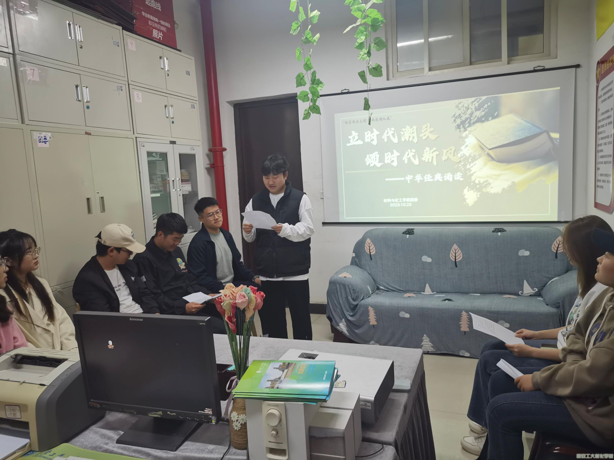 为弘扬中华优秀语言文化,增强团员青年中华民族共同体意识。西安工业大学材料与化工学院于2023年10月23日,在工三-413举办“立时代潮头,颂时代新风”中华经典诵读活动。本次活动由学生干部祁心雨主持,20余名学生代表参与活动。