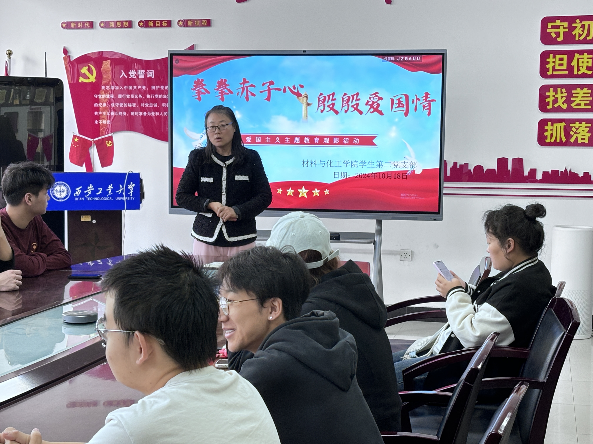 为弘扬爱国主义精神,缅怀革命先烈的丰功伟绩,增强青年学生的国家意识和责任感,2024年10月18日上午9点材化学院学生第二党支部在工3-410组织了一场以“拳拳赤子心,殷殷爱国情“为主题党日活动。此次活动由支部书记张瑞红主持,全体党员参与和观看了爱国影片《建国大业》。