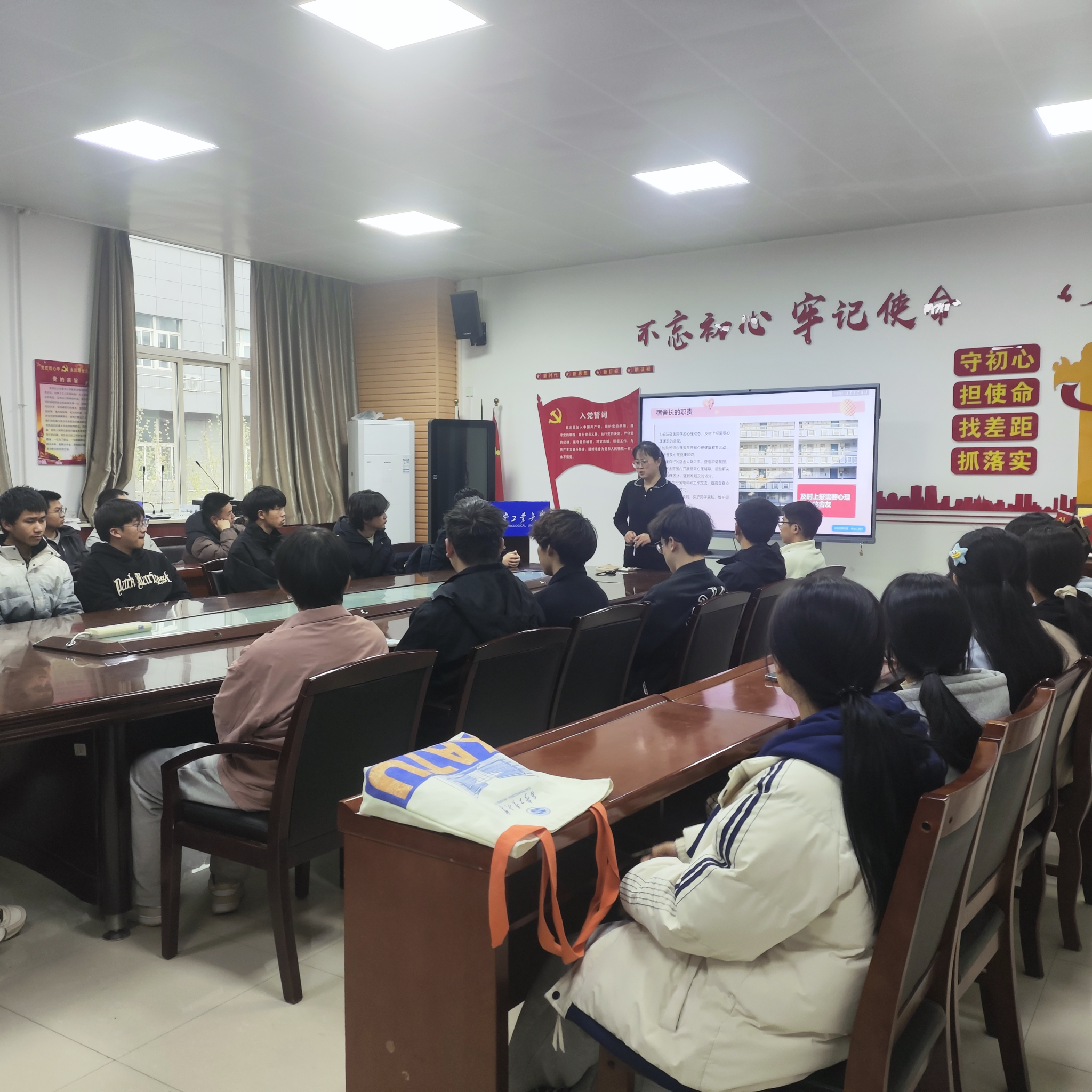 为提升宿舍长在学生心理健康工作中的作用,营造文明和谐的宿舍环境,2025年3月27日,材料与化工学院2023级于工3-410召开了“‘宿’说文明,‘心’育美好”宿舍长心理工作培训会议。此次会议由2023级辅导员乔娜主持,2023级全体宿舍长参与。