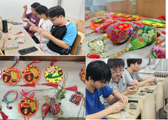 活动伊始,同学们分组围坐,在工作人员的指导下展开制作,化身不同手工的制作者,感受端午文化带来的民族自豪。香囊制作区飘着艾草清香,大家裁剪彩布、填充药草、缝制收口,再串上五彩绳流苏;手绳编织区的同学们则以彩线编结五彩手绳,指尖翻飞间绳结渐成。大家互动教学,笑语与艾香交织,传统技艺在协作中生动传承。随后,同学们们带着自己的手工合影留念,照片中,一个个挂着五彩流苏的香包和一条条色彩斑斓的手绳,生动形象的勾住人的眼球。最后,参与者们纷纷表示感受到了浓厚的端午文化情结。