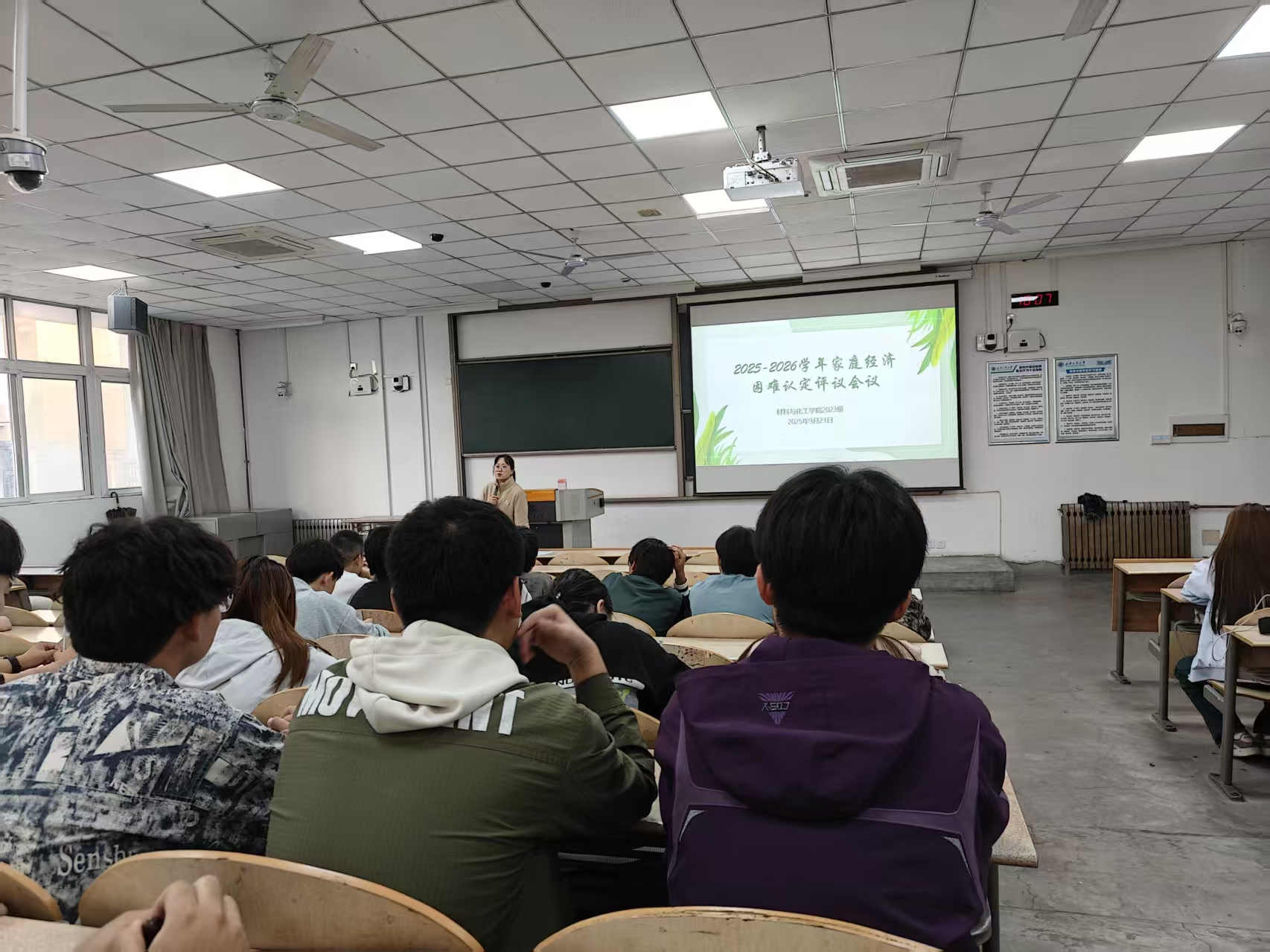 为确保2023级家庭经济困难学生认定工作的公平、公正、合理,有效实现精准资助,9月23日晚,材化学院2023级在教1-101开展“2025-2026学年家庭经济困难认定工作会议”。会议由2023级辅导员乔娜主持,各班评议小组及部分学生代表参会。
