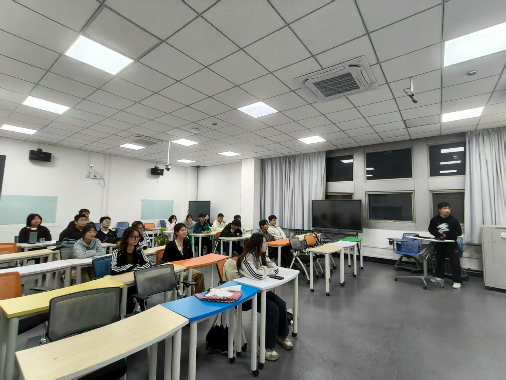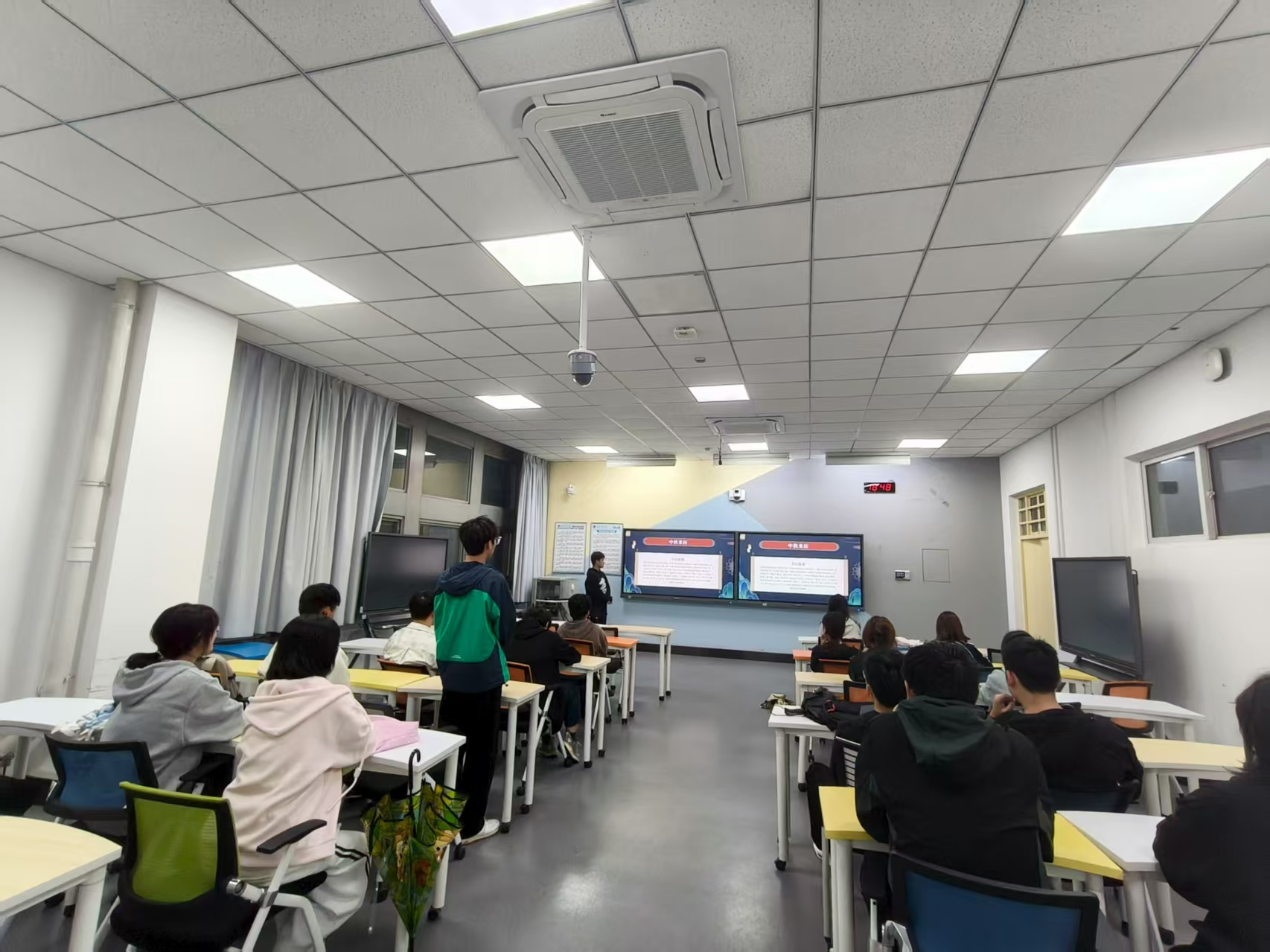 随后,谢金洋系统讲述了中秋节的起源与发展,带领同学们品读了杜甫“露从今夜白,月是故乡明”等经典诗词,大家纷纷结合自身经历,踊跃分享“小家团圆”与“大国发展”紧密相连的动人故事。有同学讲述了家人在节日期间坚守岗位、护航万家灯火的感人事迹;有同学分享了见证家乡在国家政策支持下日新月异发展的切身感受。这些朴实而真挚的分享引发了强烈共鸣,让“家国一体”的理念在讨论中深入人心。班会尾声,教室响起《我和我的祖国》,明亮的灯光与动听的歌声交织,汇聚成一片充满爱国热情的海洋。