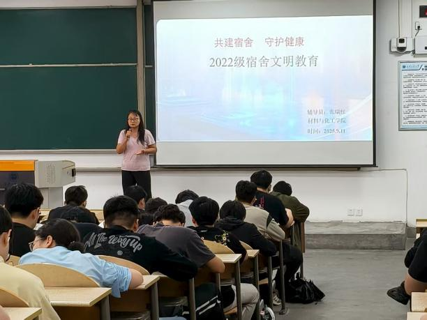 为加强学生宿舍管理,营造文明、整洁、安全、和谐的宿舍环境,提高学生的文明意识和宿舍生活质量,2025年9月11日,材料与化工学院在教1-101召开了学生宿舍文明教育会议。会议由辅导员张瑞红主持,2022级全体学生参与。