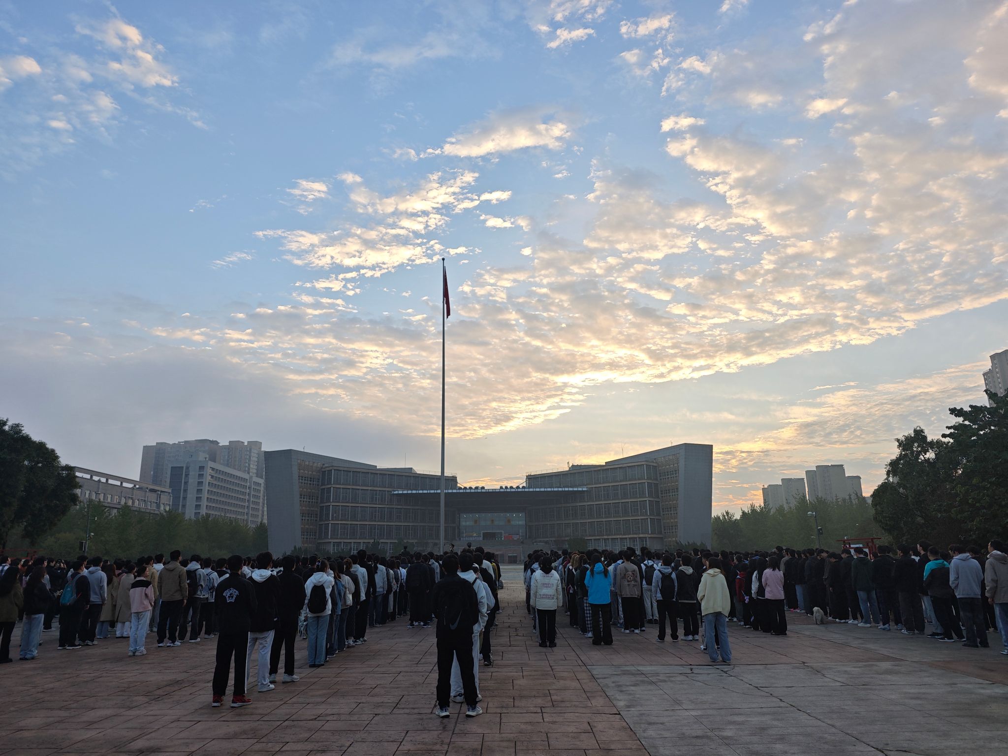 7时,伴随着激昂的《义勇军进行曲》,五星红旗冉冉升起、迎风飘扬,全体师生面向国旗行注目礼,高唱国歌,心中的爱国之情与民族自豪感油然而生。