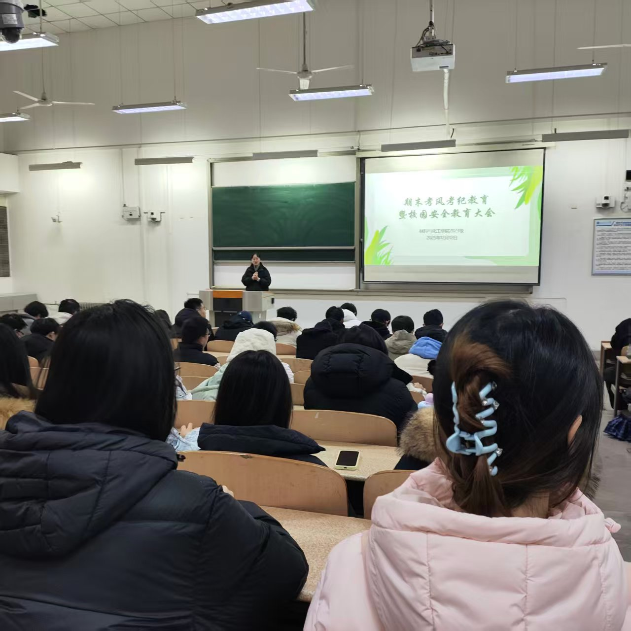 为严明大学英语四六级考纪和期末考纪、筑牢安全防线,切实保障期末考试工作平稳有序开展,守护学生平安健康度过期末阶段,12月12日,材料与化工学院2023级在教1-205召开期末考风考纪教育暨校园安全教育大会,全体2023级同学参会,会议由辅导员乔娜主持。