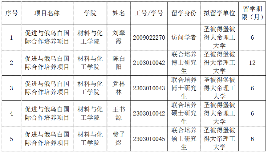 根据国家留学基金委2024年促进与俄乌白国际合作培养项目要求,我院于2024年9月启动第二批促进与俄乌白国际合作培养项目院内遴选工作。经个人申请、导师推荐、学院和学校审核,确定5名候选人,现予以公示。公示时间:2024年9月2日至2024年9月6日。