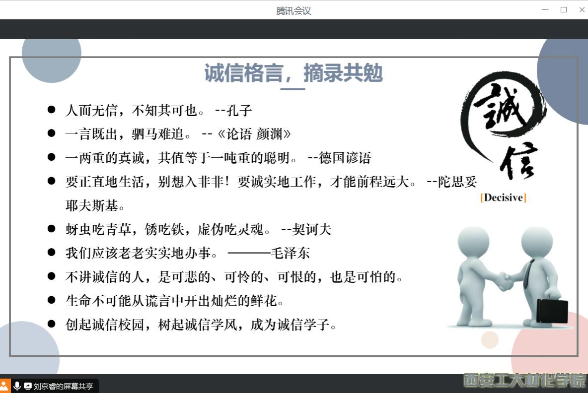 此次“诚信立身,秉信立行”诚信教育主题会议的成功举办,不仅提高了学生对诚信考试的认识,也激发了他们践行诚信的热情和动力。相信在学院师生的共同努力下,材料与化工学院将继续深化诚信教育工作,共同营造诚实守信的校园文化氛围。