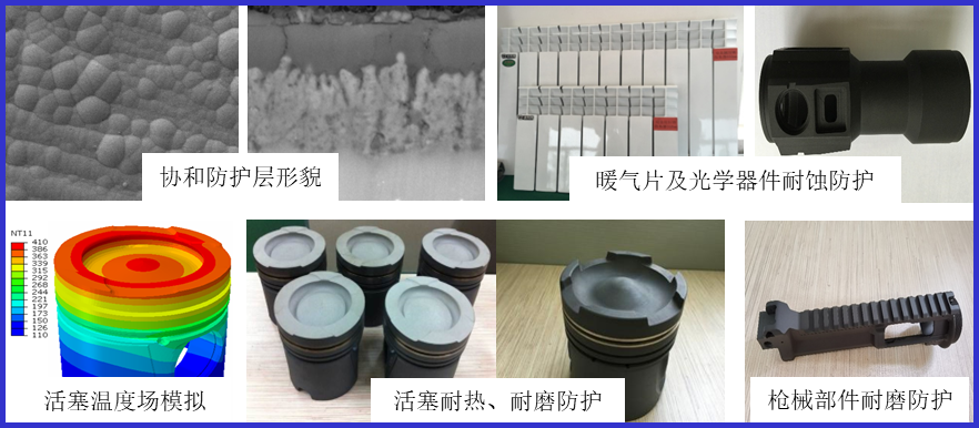 开发了化学氧化、阳极氧化、等离子电解氧化、化学镀、等离子电解渗、有机涂层等十余种金属、无机、有机及复合耐蚀、耐磨、耐热协和改性防护技术,显微硬度>2000 HV,摩擦系数<0.2,隔热温度提升50 ℃以上,耐蚀性提高1个数量级。已在军民用发动机活塞、光学器件、轻武器、暖气片等领域应用。