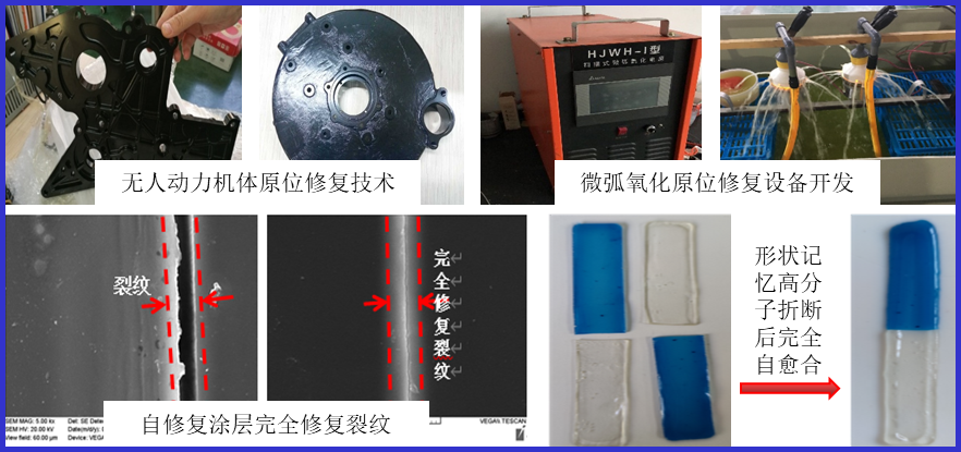 开发了化学转化复合有机涂层原位修复技术,在此基础上,开发了原位涂层修复设备;开发了光热、pH、温度等环境响应形状记忆智能有机自修复技术,可根据外界环境差异可控释放修复剂,形状记忆有机涂层当开裂后可快速自愈合。