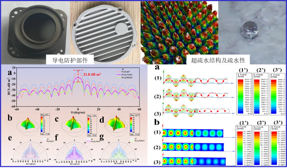 开发了有机超疏水、导电氧化、化学镀、复合有机导电涂层等超疏水、导电、电磁屏蔽功能防护技术;进一步开发了高比表面积MOFs/轻质碳基复合吸波材料,同时开发了导电配位聚合物与磁性纳米粒子微观协同的宽频吸收隐身功能防护技术,已在雷达、弹件等部件领域应用。